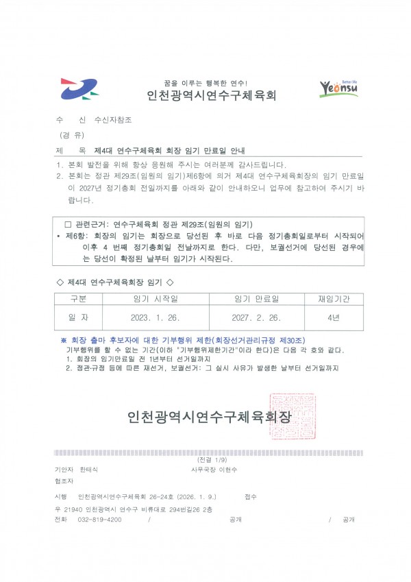 제 4대 인천광역시연수구체육회 회장 임기 만료일 안내 페이지 정보 작성자 관리자 조회186회 작성일 26-01-09 10:10 본문 제 4대 인천광역시연수구체육회 회장 임기 만료일 안내 목록 댓글목록 댓글목록 등록된 댓글이 없습니다.