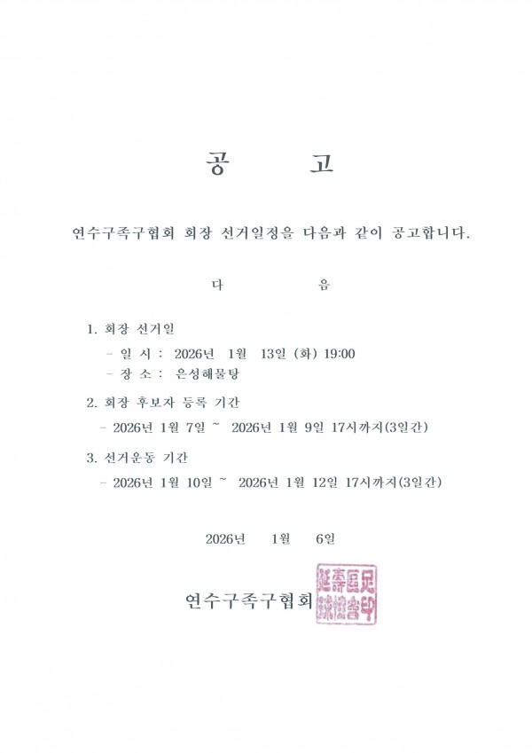 족구 연수구족구협회 회장선거 공고 페이지 정보 작성자 관리자 조회99회 작성일 26-01-06 09:21 본문 연수구족구협회 회장선거 공고 목록 댓글목록 댓글목록 등록된 댓글이 없습니다.
