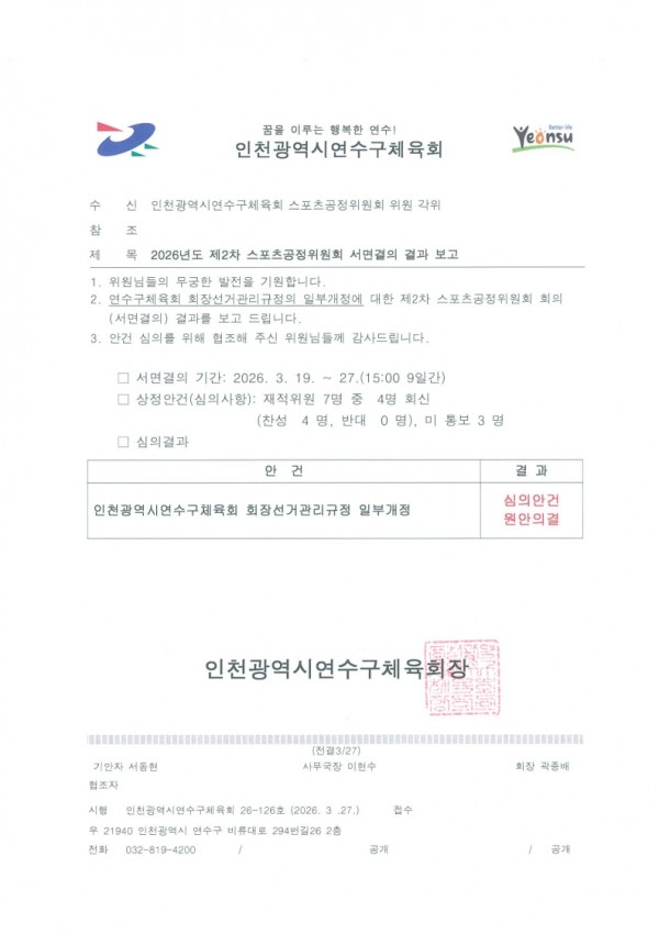 2026년도 제2차 스포츠공정위원회 서면결의 결과 보고 페이지 정보 작성자 관리자 조회42회 작성일 26-03-30 10:55 본문 2026년도 제2차 스포츠공정위원회 서면결의 결과 보고 목록 댓글목록 댓글목록 등록된 댓글이 없습니다.