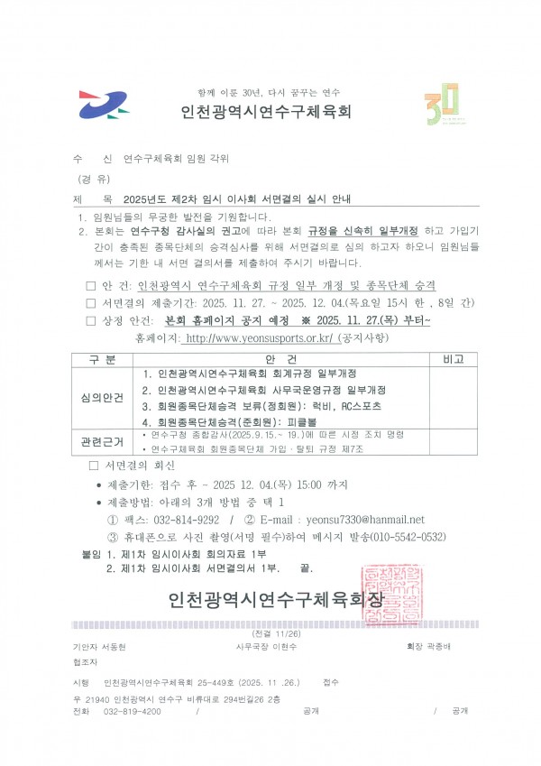 2025년도 제2차 임시 이사회 서면결의 실시 안내