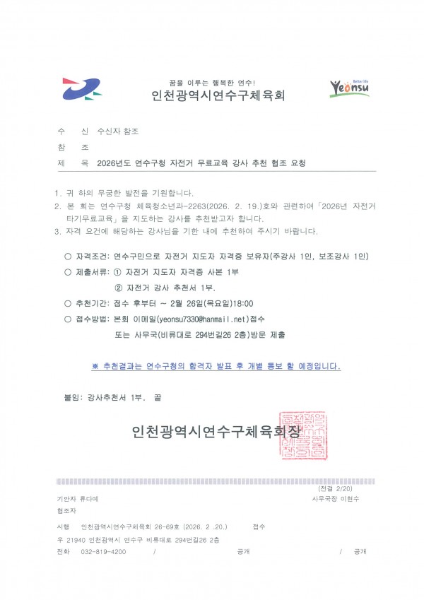 2026년도 연수구청 자전거 무료교육 강사 추천 협조 요청 페이지 정보 작성자 관리자 조회120회 작성일 26-02-20 09:53 본문 2026년도 연수구청 자전거 무료교육 강사 추천 협조 요청 첨부파일 강사추천서양식.hwp (36.5K) 8회 다운로드 | DATE : 2026-02-20 09:53:42 목록 댓글목록 댓글목록 등록된 댓글이 없습니다.
